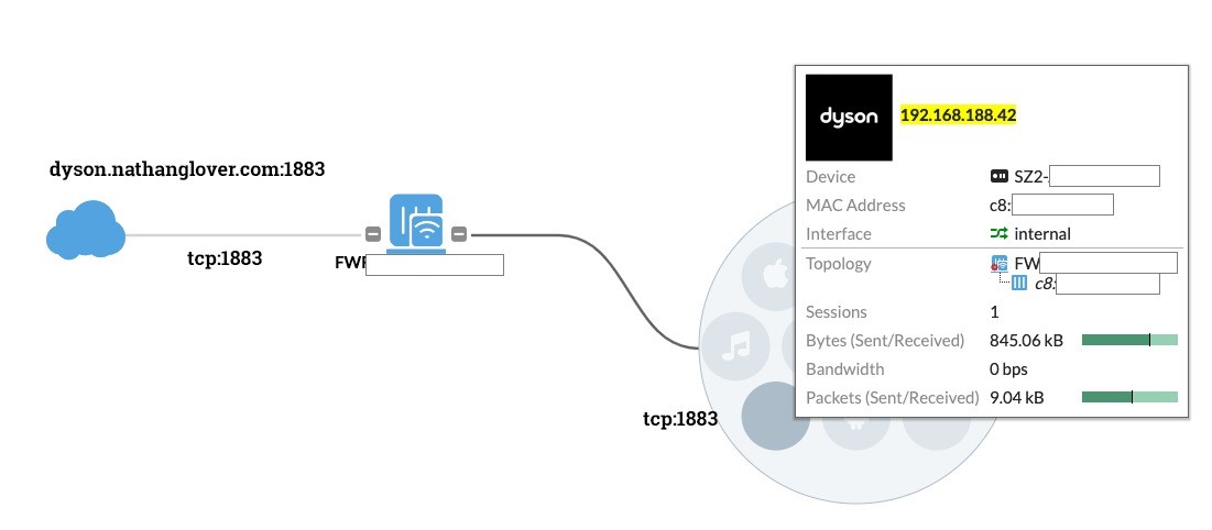 The Dyson device talks over MQTT on port 1883; so we simply forward that port for the device internally. I've also attached a domain endpoint for the use of resolving my IP (you don't need this however).
