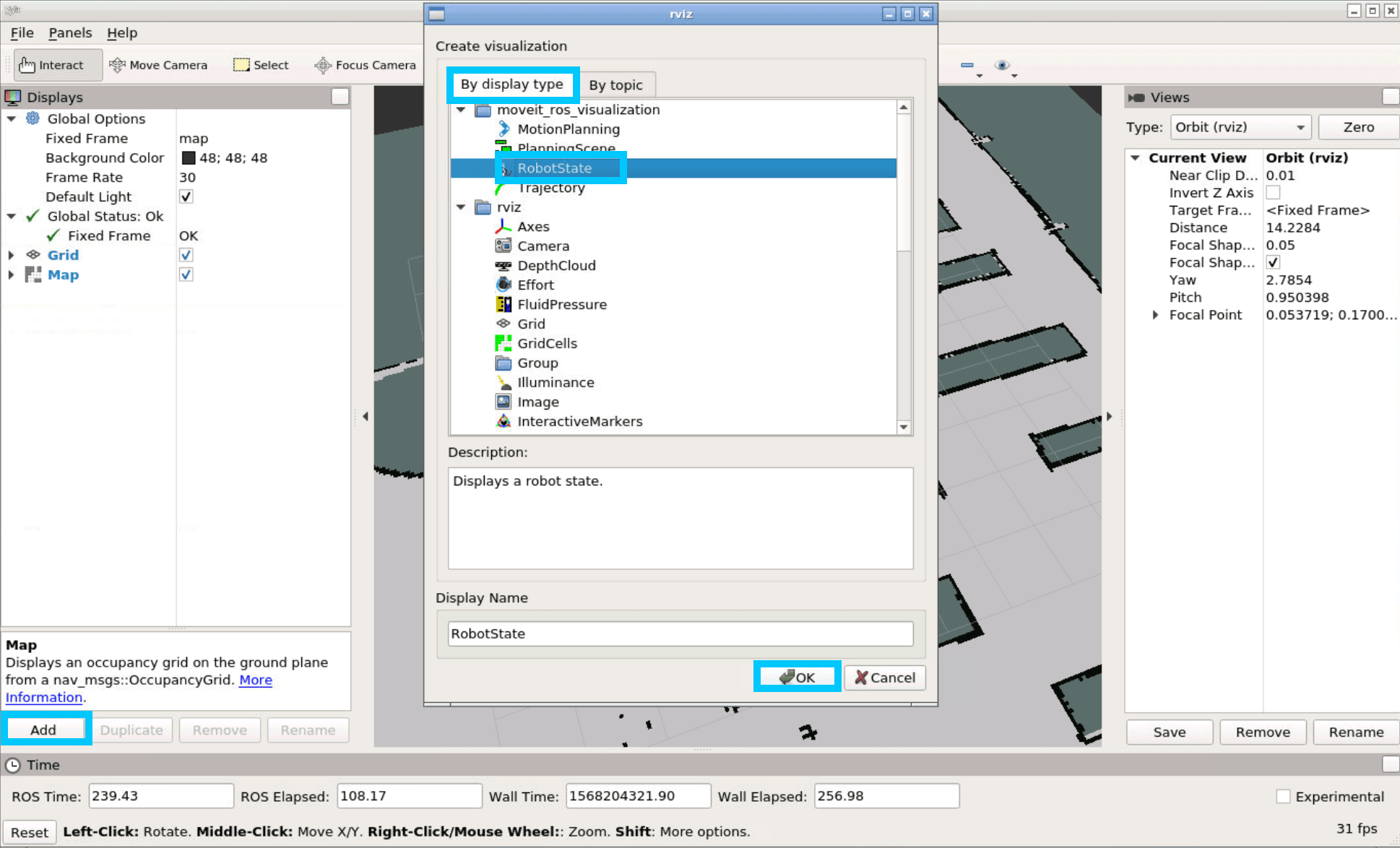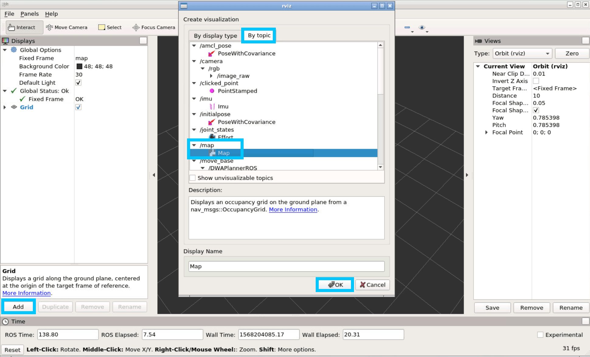 rvizYou'll be greeted with a UI. From here you need to add the Map from the topic
