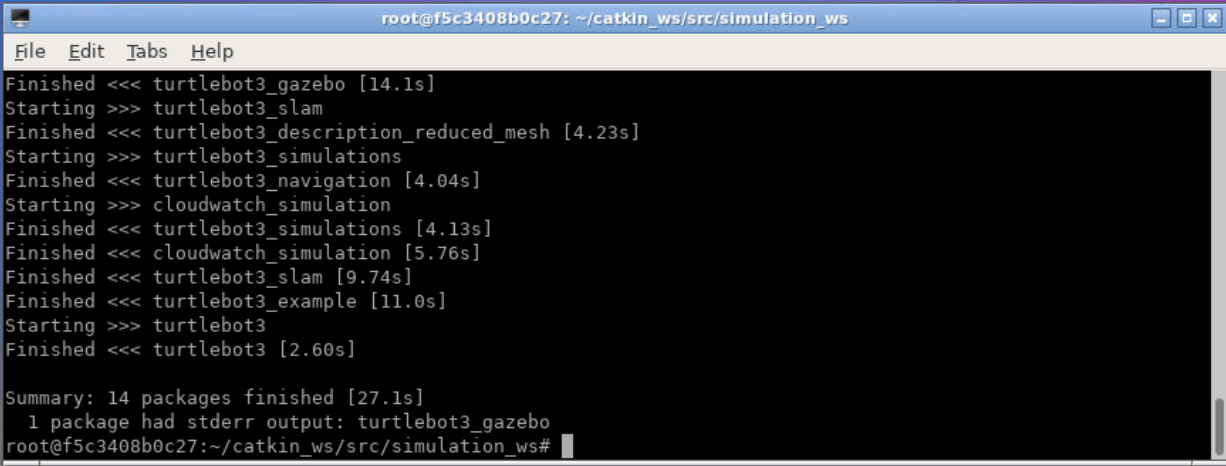 - git: {local-name: src/deps/turtlebot3_simulations, uri: "https://github.com/ROBOTIS-GIT/turtlebot3_simulations", version: 1.2.0}The final step is to build the local packages. For this, we use colcon which will orchestrate all the necessary steps to build all the modules.