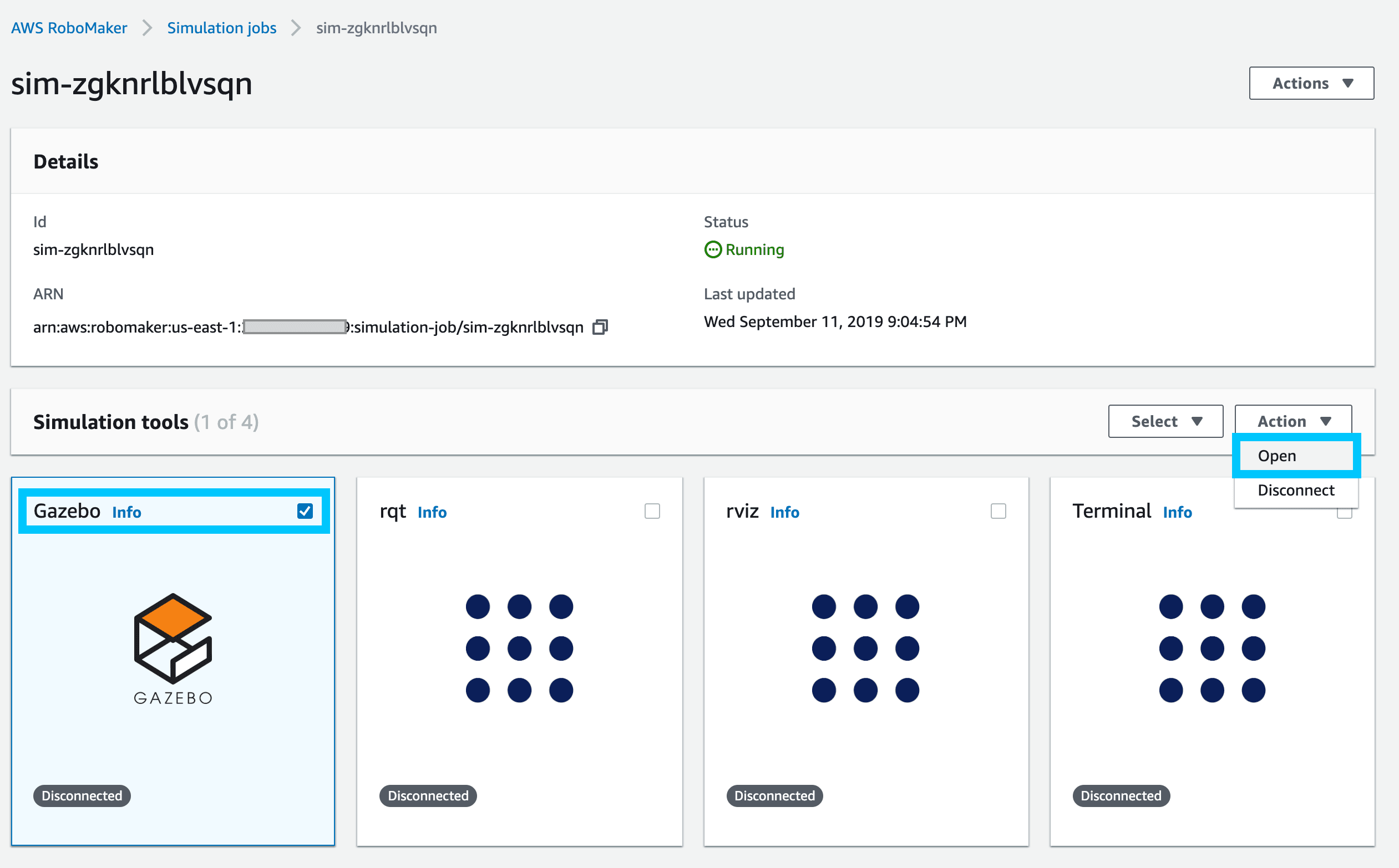 aws robomaker create-simulation-job --cli-input-json file://RoboMakerJob.jsonHead over to the Web interface and check out the Simulation Job you just created. Once loaded up, open an instance of Gazebo.