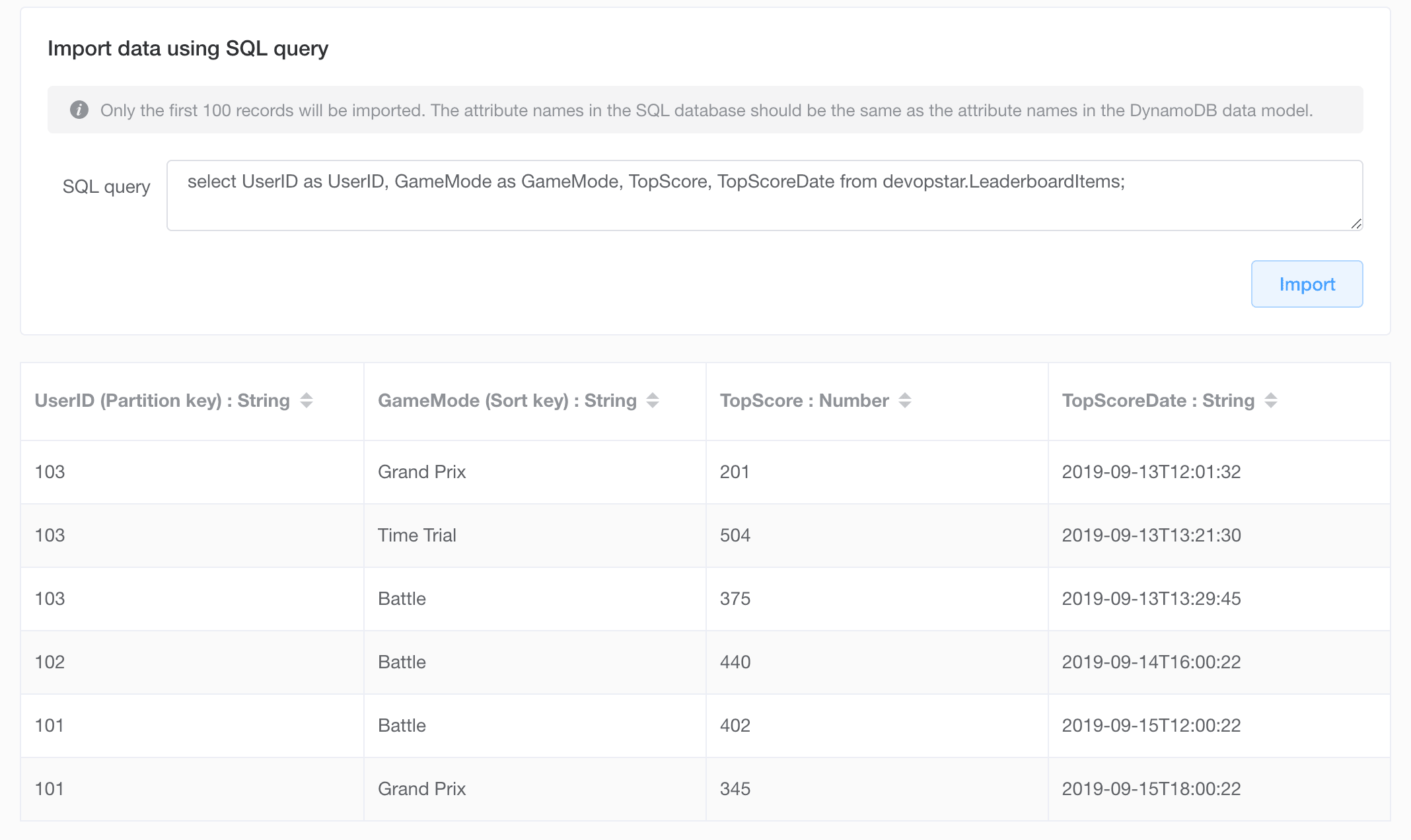 select UserID as UserID, GameMode as GameMode, TopScore, TopScoreDate from devopstar.LeaderboardItems;I've included an example of how to remap keys by using the as operator. Click Import to proceed to the next modal that will prompt for SQL connection details