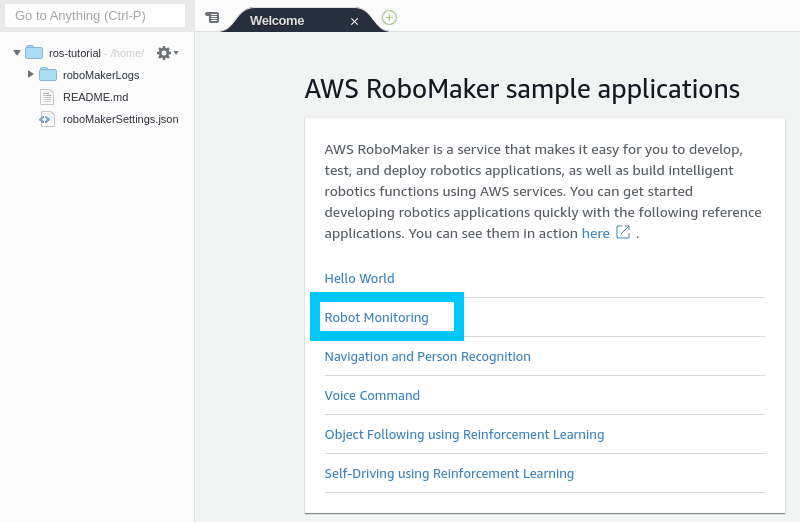 Once the environment starts up we're just going to open an example project by clicking "Robot Monitoring". You will begin to see a download occurring pulling down the sample project, and once complete you will be presented with a README.