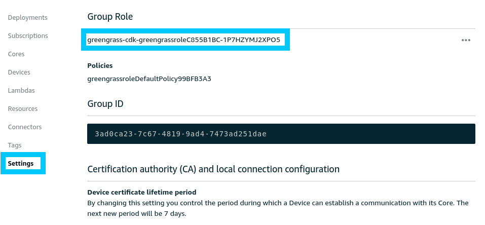 aws s3 mb s3://unique-bucket-nameAlternatively you can create a bucket from the UI. Next navigate to your Greengrass group and retrieve the role name attached to your device.