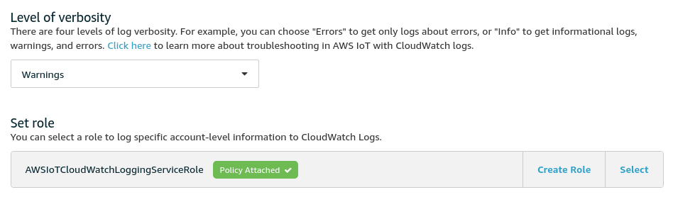 }Now if you check CloudWatch under the log group called AWSIotLogsV2 you should see log streams.