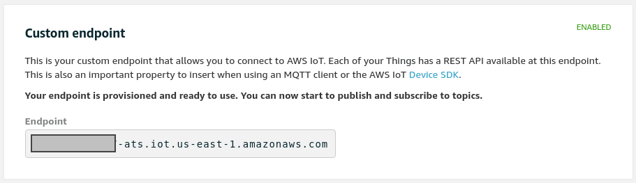 - Retrieve the data endpoint by navigating to the AWS IoT Settings UI. Make sure you are in the correct region as well.
