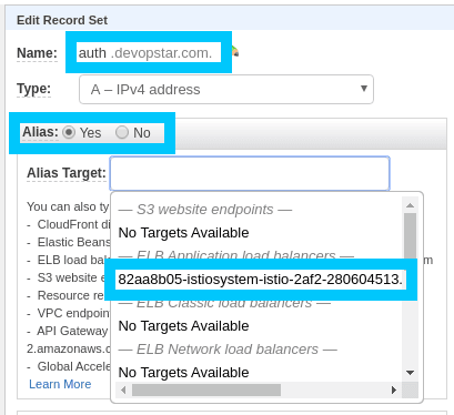 NOTE: Alternatively (and the way we are going to do it) you can set up the auth.devopstar.com domain to point to the ALB created Kubeflow. Head on over to Route53 and update the A records alias (for your equivalent of auth.devopstar.com)