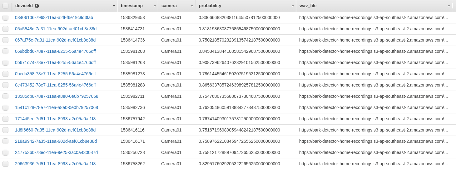 prediction['timestamp'] = timestamp + (i * segment_length)If an item is defined as a dog bark and also has a probability of higher then 75% then an entry is added to DynamoDB and CloudWatch Metrics