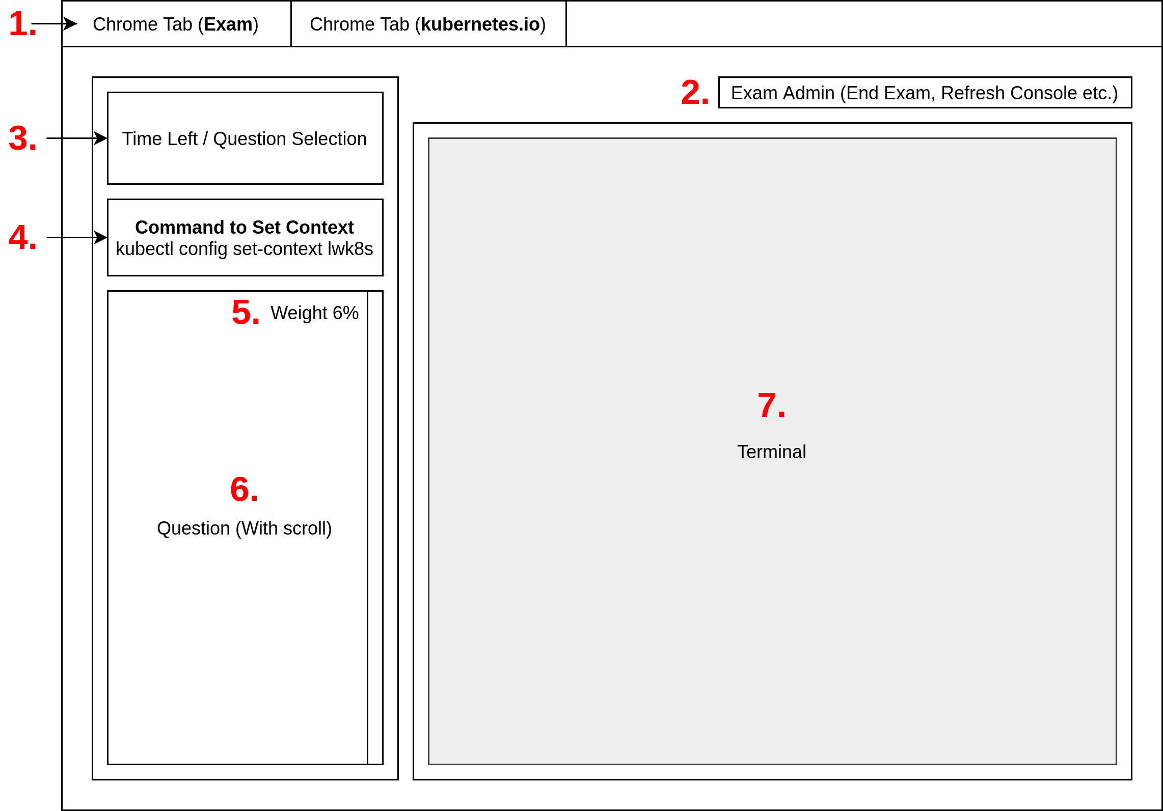 I've done my best to drawn out the diagram below to give you a feel for what you can expect to see when you login to your CKA (or CKAD) environment.