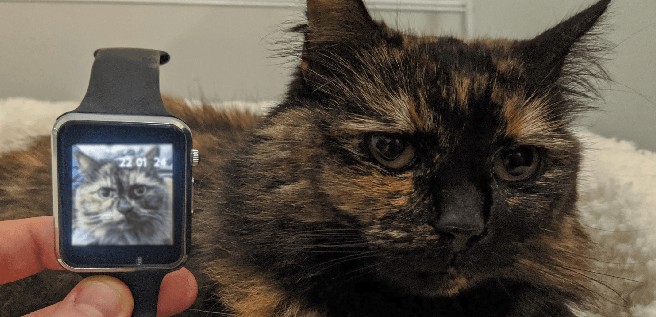 Once the upload is complete, the watch should automatically start up and display the image of my (or your) cat.