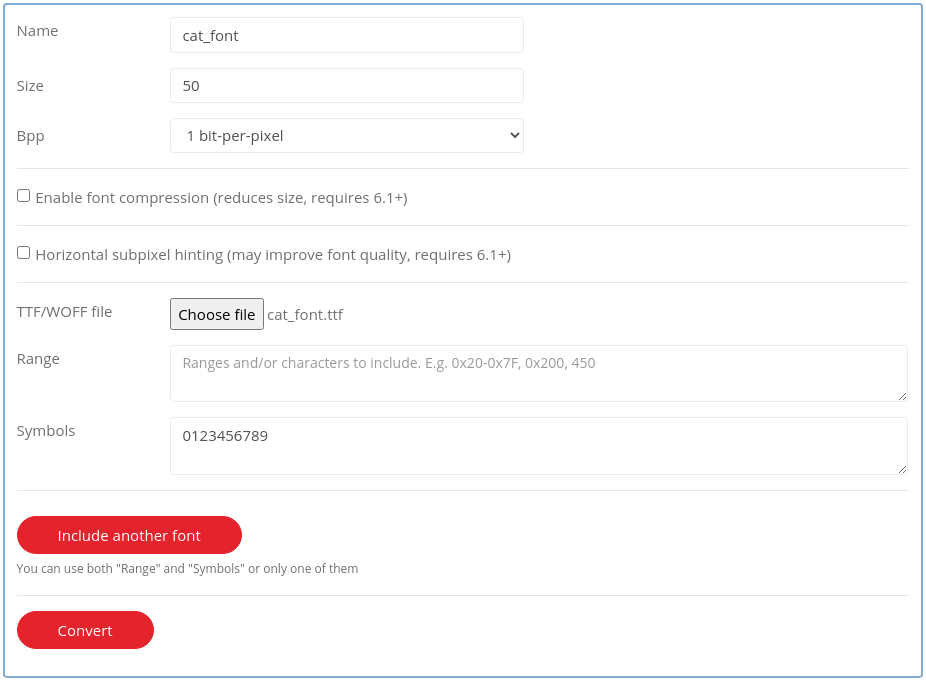 Then navigate back to the fontconverter tool and upload the file. Copy down similar settings to what I've used, and define all the symbols you want converted (I've just used the numbers 0-9).