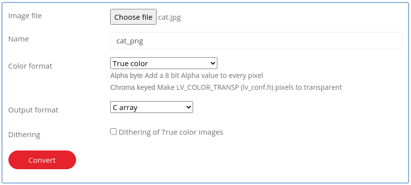 Click convert and you'll be given an output file called cat_png.c which, like before can be placed to override the existing file I had in the ultimate-cat-watch project.