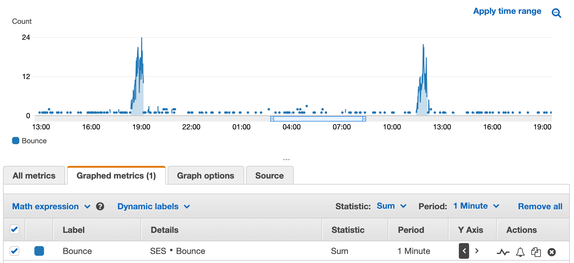 It wasn't for another 14 hours but I suddenly received a notification saying that there was a very high number of bounces coming through. Checking the metrics revealed that again, I was being attacked