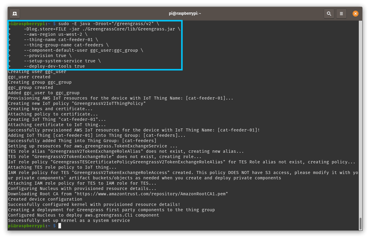 You should soon have access to the greengrass-cli on the Raspberry Pi once the deployment completes. Back on the Raspberry Pi you can test this by running the following: