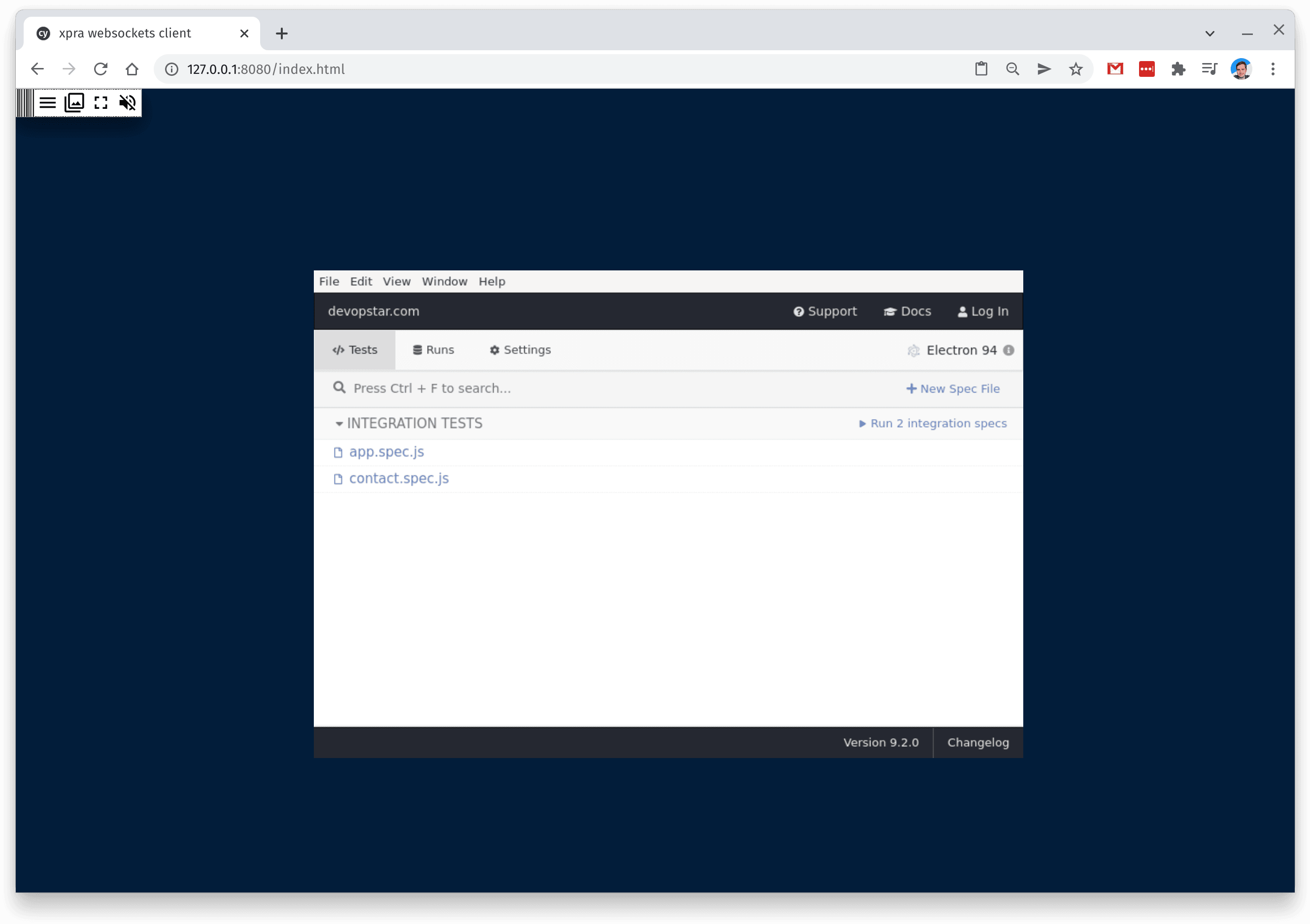 npm run test:e2eOnce Cypress has fired up, you should see it pop up in the browser at http://127.0.0.1:8080/index.html