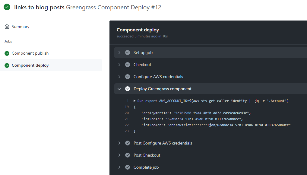 Click on the job list on the left to get a breakdown of each step. As you can see the Greengrass deployment was a success and the deployment ID is even printed out to the actions console