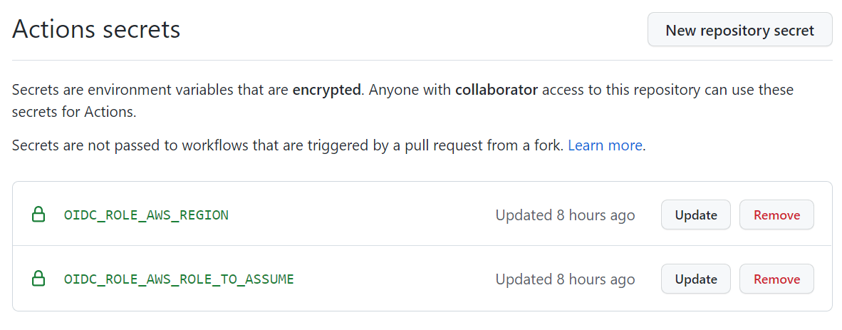 Depending on if you are wanting to use the OIDC provider above, or if you want to use AWS access tokens, you will need to create a couple of GitHub repository secrets.