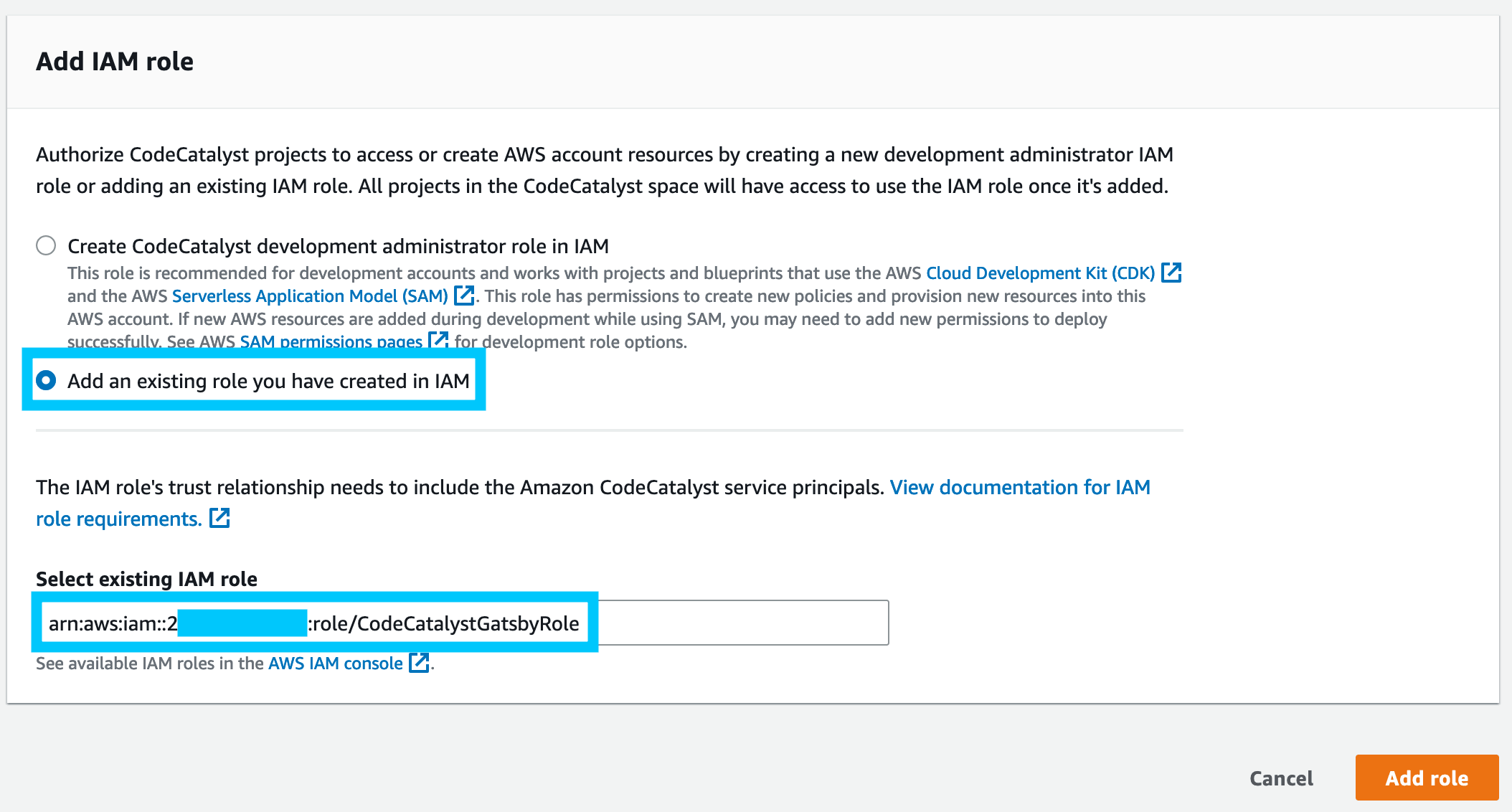 This role will now be available to CodeCatalyst environments and can be targetted in your workflows later on in this guide.
