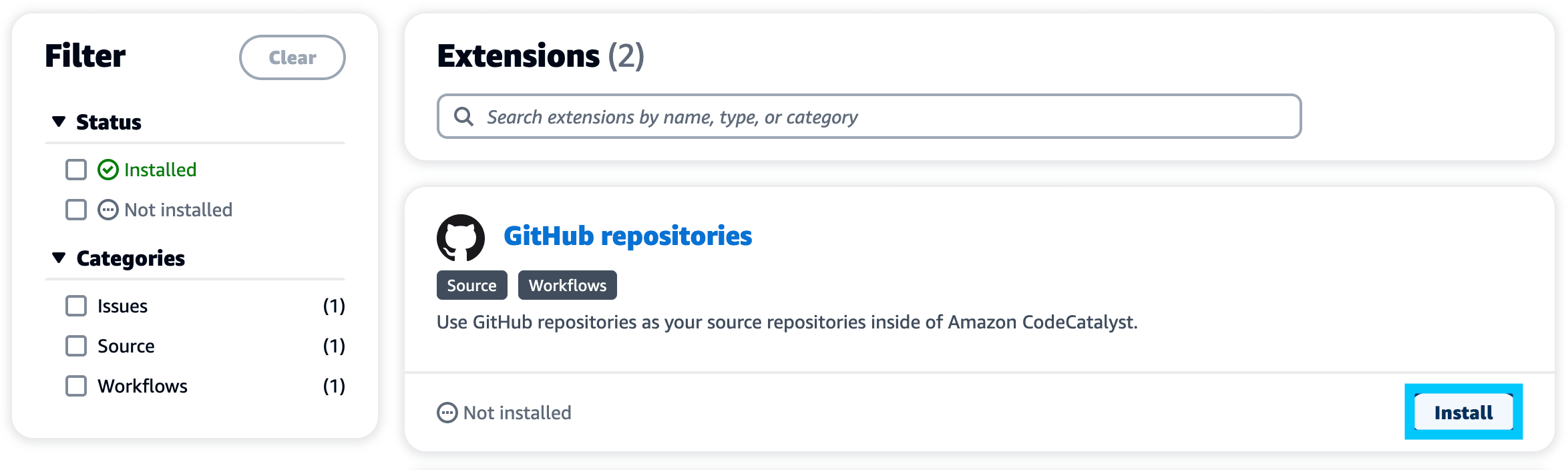 Head back over to CodeCatalyst and click Installed extensions under your newly created space. Filter and find the GitHub repositories extension and click Install.