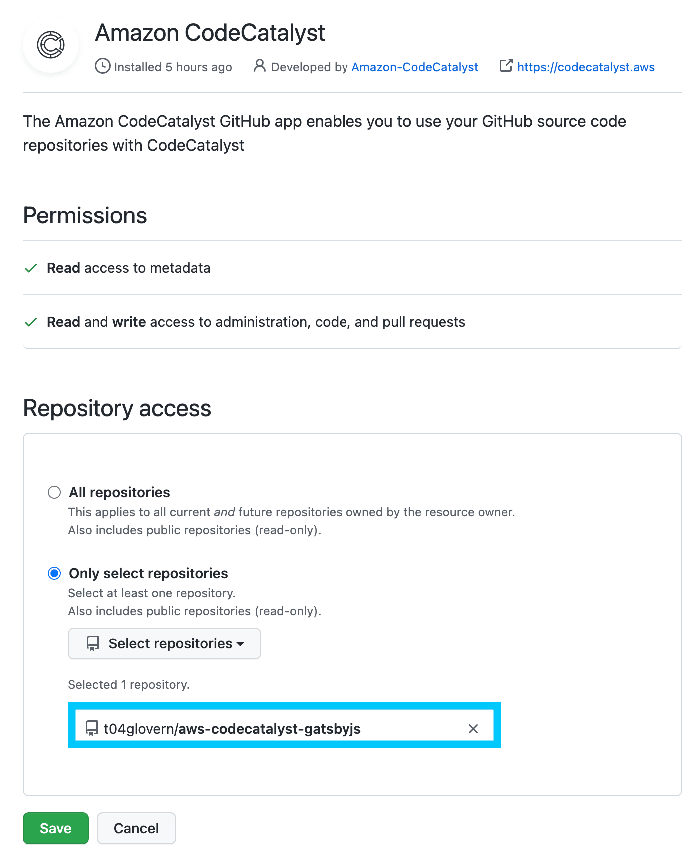 In my case, I've only given the CodeCatalyst app access to my t04glovern/aws-codecatalyst-gatsbyjs repository - If you are following along at home you should select whatever repository you want to use.