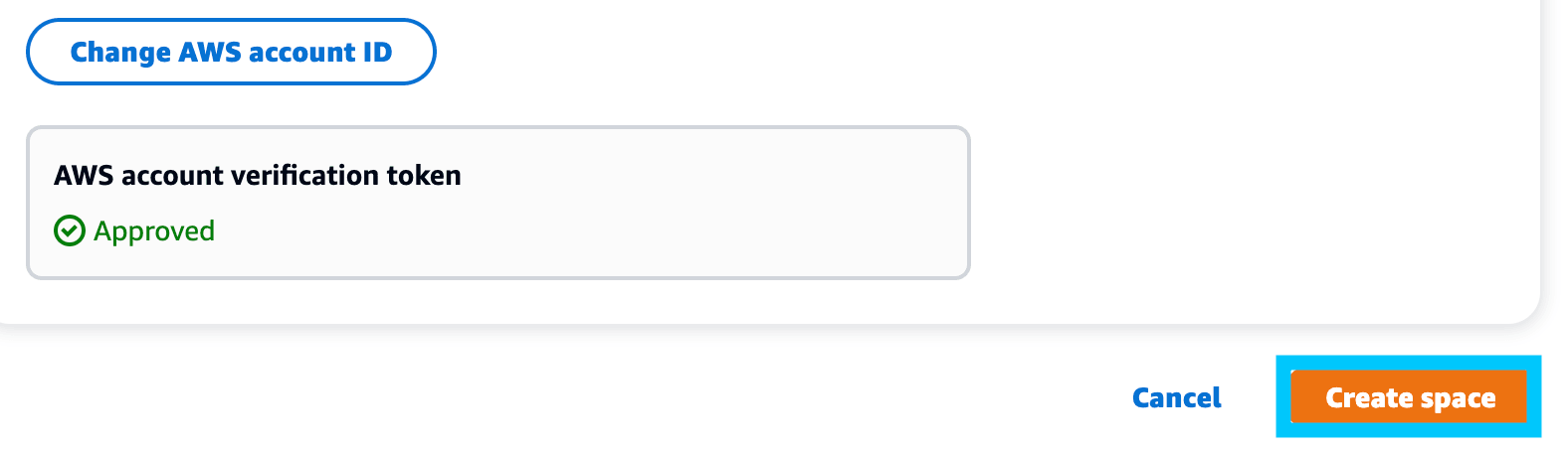 When you've clicked Verify Space, the Amazon CodeCatalyst console should change to show a green tick and the word Approved. It will also allow you to proceed with creating the space. Do so by clicking Create space.