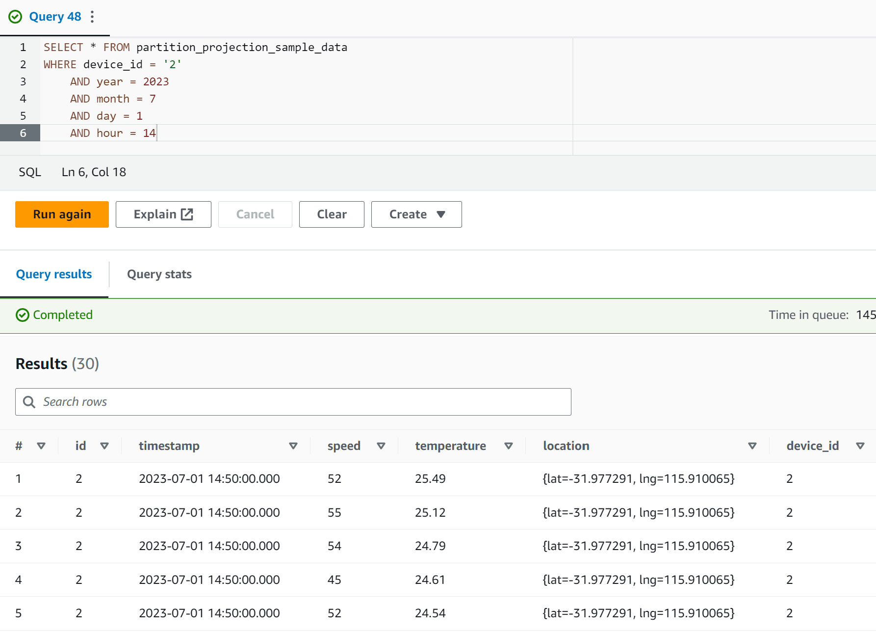 - WHERE device_id = '2': This part of the query demonstrates the power of partition projection. Instead of scanning all the data, Athena immediately knows to narrow the search to files inside the