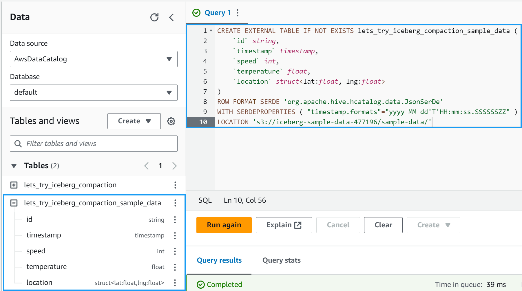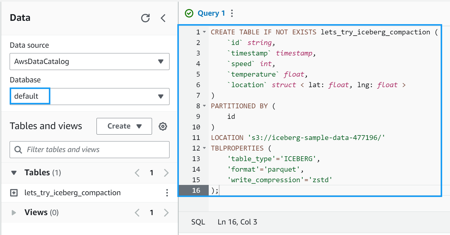 Take the contents of the 1-athena-iceberg-create-table.sql file and paste it into the query editor. Click Run to create the table.