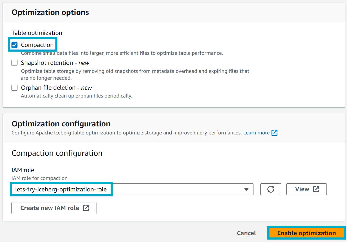 You will be prompted to select a role to use for compaction. Select the role created by the script we ran earlier (lets-try-iceberg-optimization-role), and click Enable compaction.