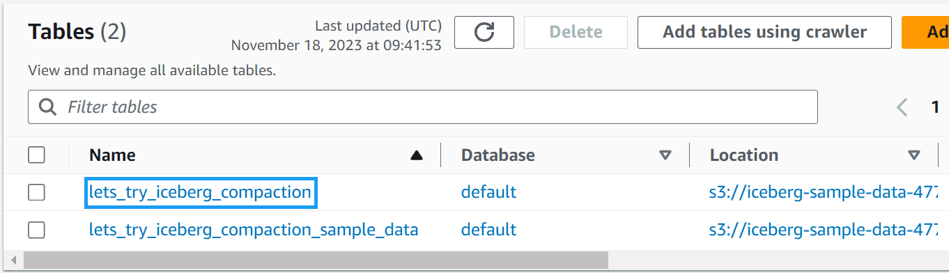 Navigate to the AWS Glue tables console and select the lets_try_iceberg_compaction table.
