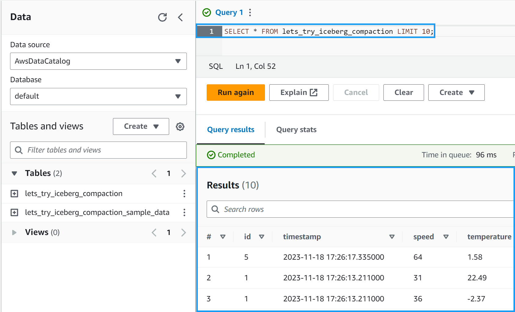 SELECT * FROM lets_try_iceberg_compaction LIMIT 10;You should see something like the following: