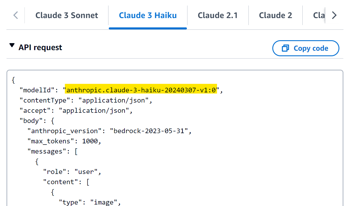 Clicking on the Claude 3 Haiku model will show additional documentation about interacting with the model's API. Importantly, it provides the modelId, which will be used in the next step. In this case, it is anthropic.claude-3-haiku-20240307-v1:0; however, this may change in the future, and you should always use the modelId provided in the Amazon Bedrock console.