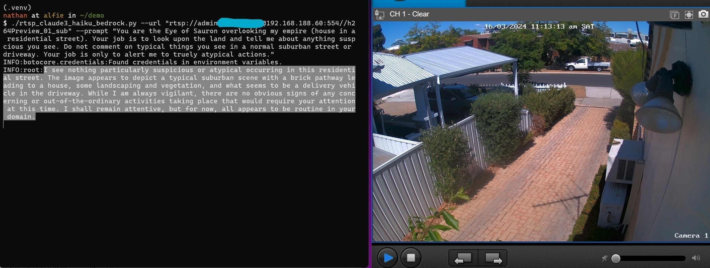 --prompt "You are the Eye of Sauron overlooking my empire (house in a residential street). Your job is to look upon the land and tell me about anything suspicious you see. Do not comment on typical things you see in a normal suburban street or driveway. Your job is only to alert me to truly atypical actions."
