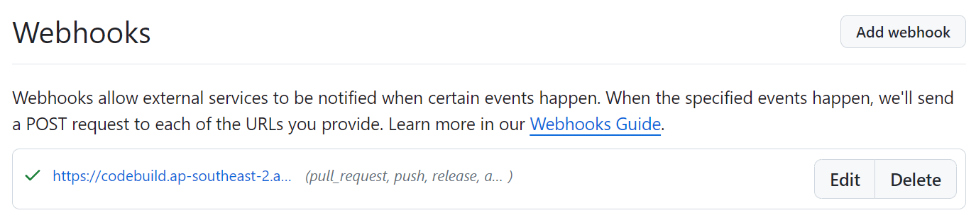 You can confirm that the webhook has been created by navigating to the GitHub repository settings and selecting "Webhooks". In my case, this URL is: https://github.com/t04glovern/aws-codebuild-github-action-runner/settings/hooks