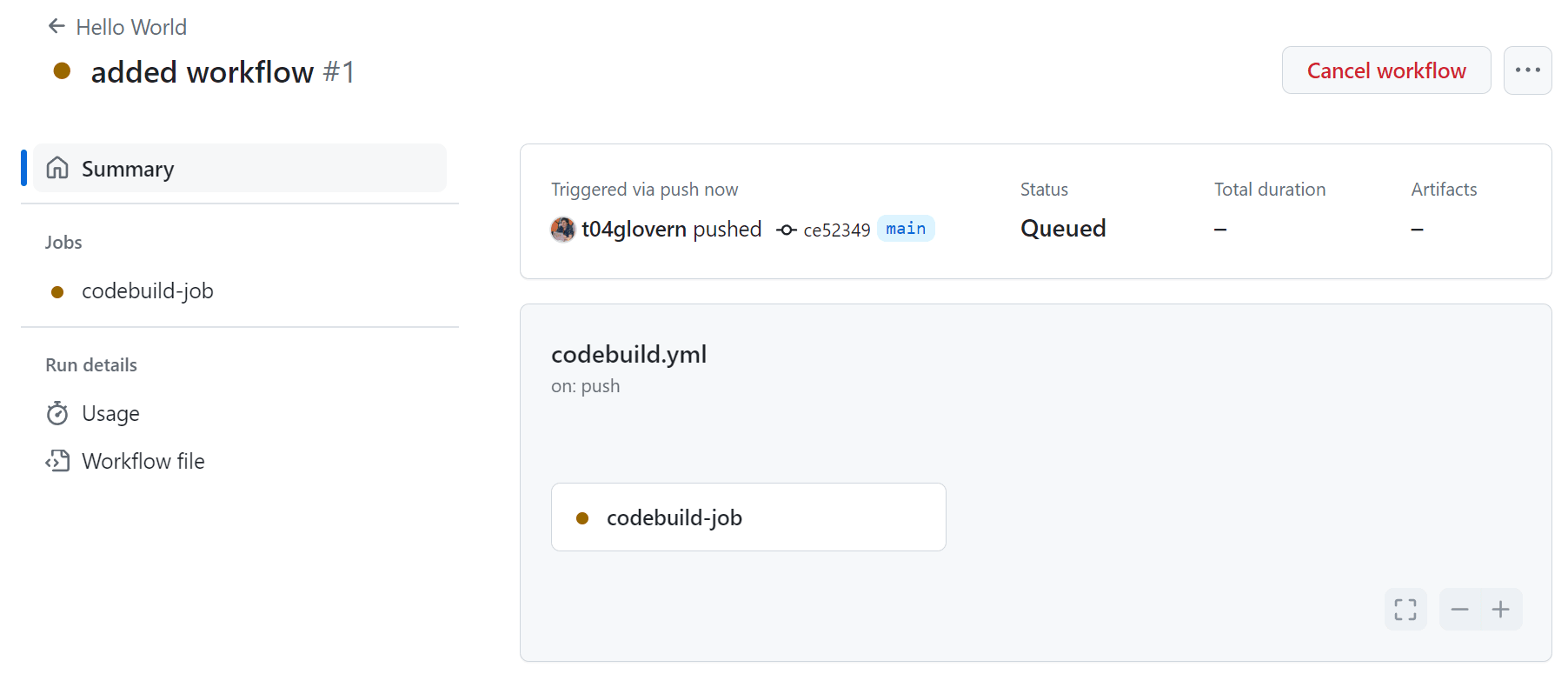 - run: echo "Hello World!"When you push this file to your repository, the GitHub Actions workflow will trigger the CodeBuild project.
