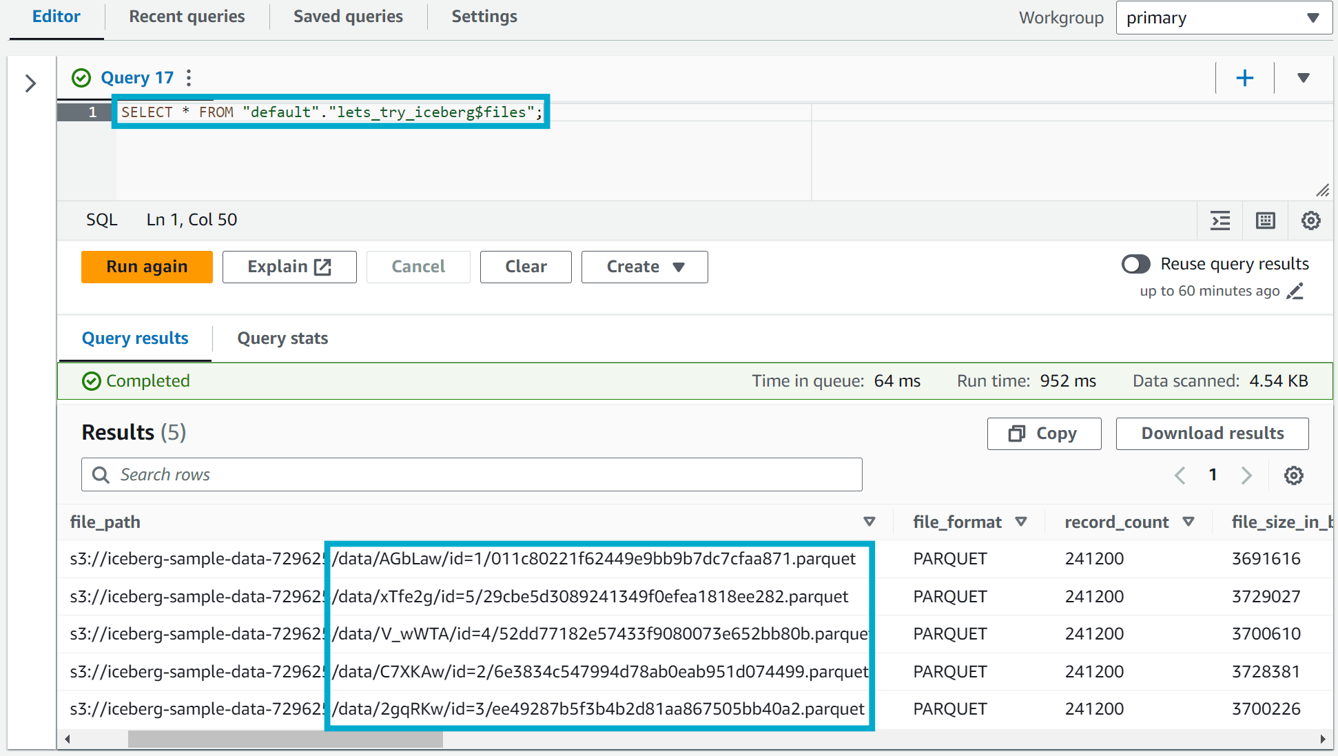 You can further confirm this by running the following Athena query against the Iceberg table which indicates that the number of files actually being used by the Iceberg table is only 5, however the storage bucket has over 705 (in my case) files.