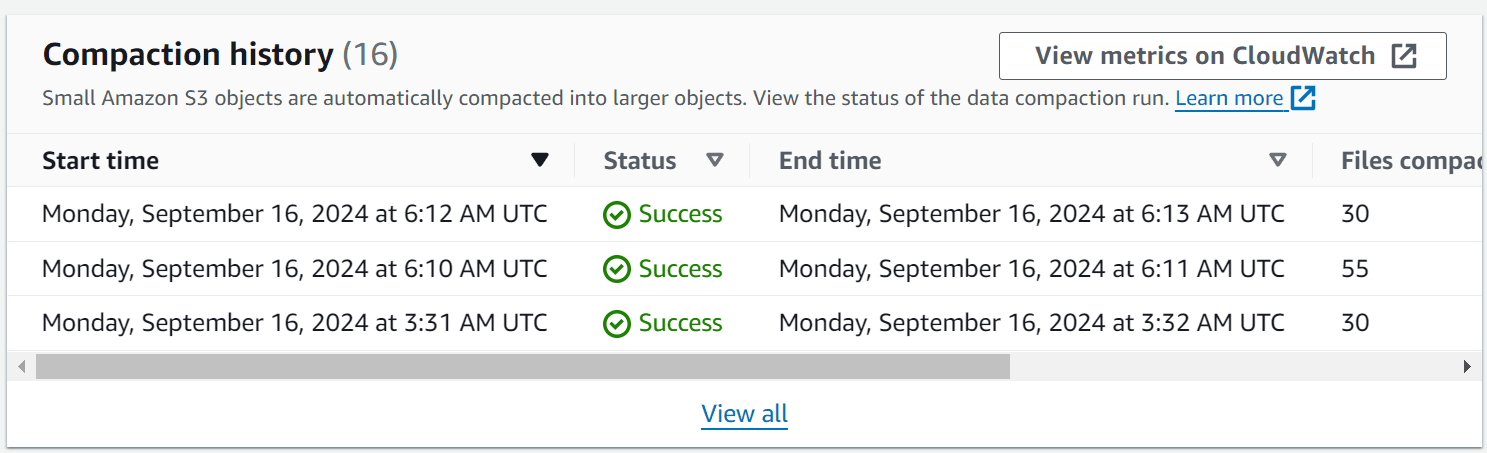 - Compaction: Combines small files into larger files so that queries against the table are more efficient.