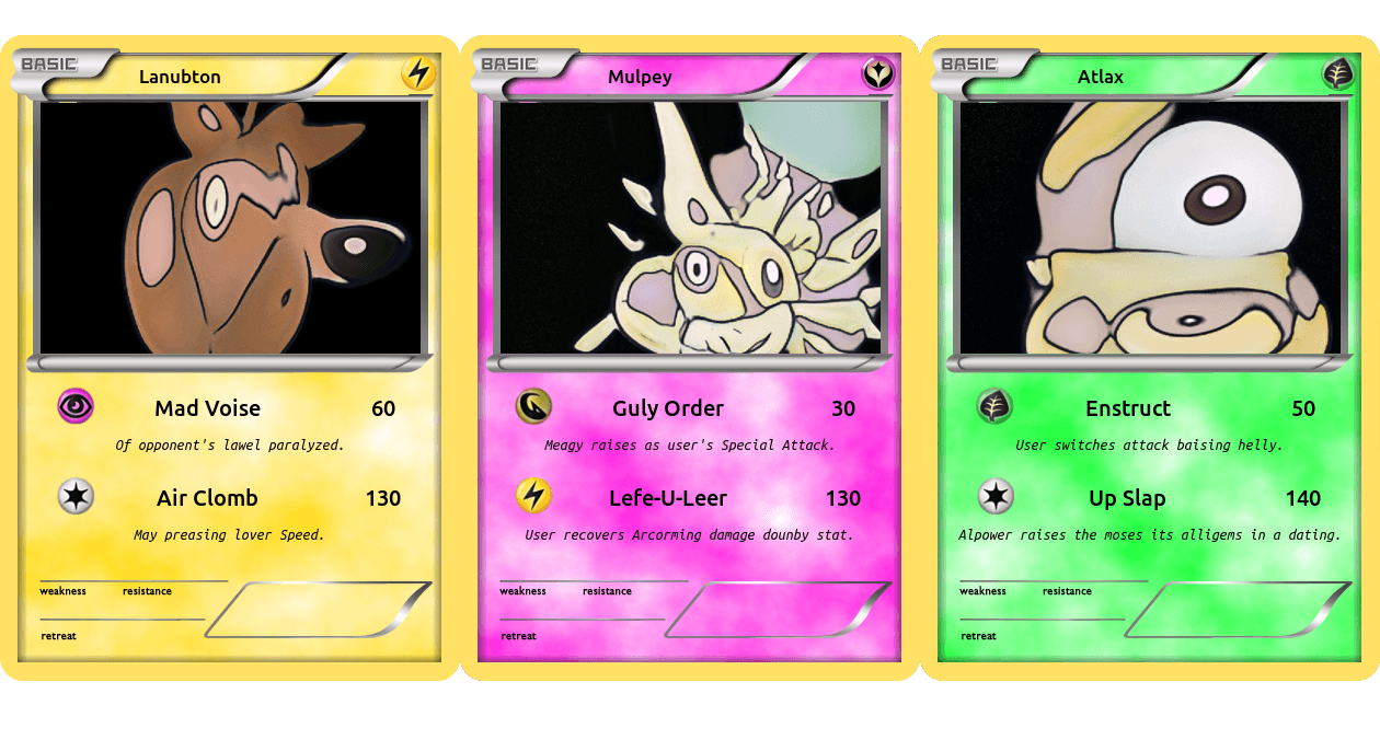This post is going to cover all the bits of pieces required to generate your very own Pokemon cards using a mixture of StyleGANs and RNNs.
