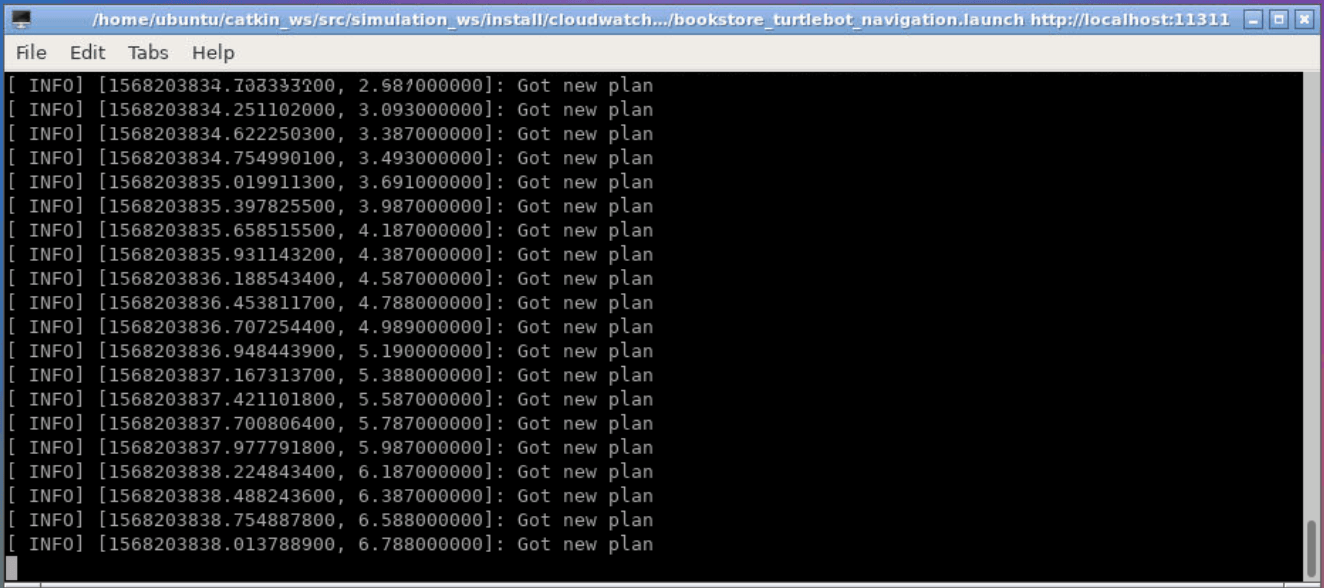 roslaunch cloudwatch_simulation bookstore_turtlebot_navigation.launchIf all goes well you should see the following that indicates that the robot is simulating