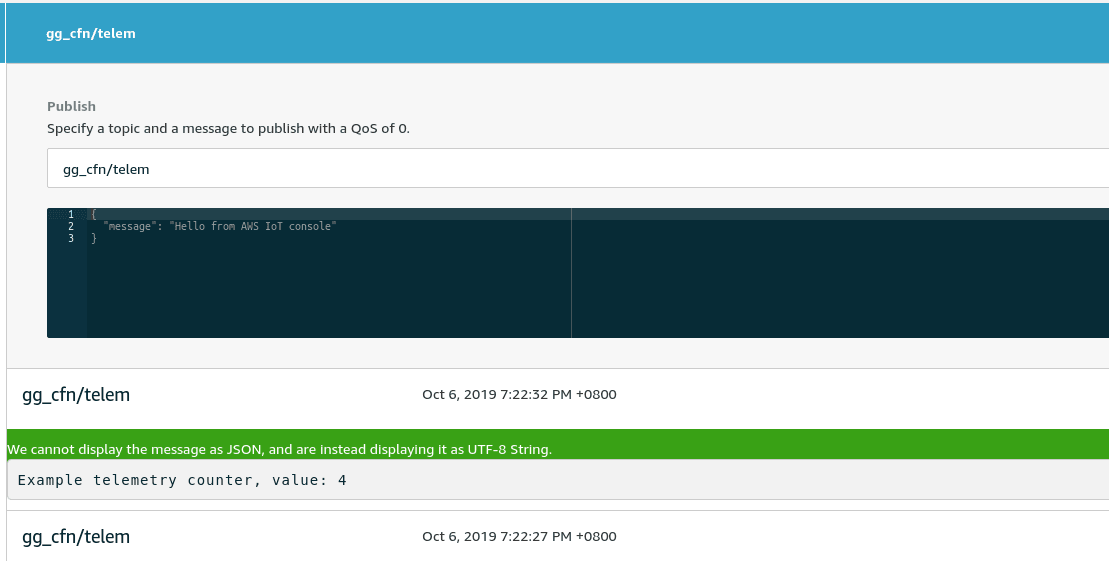 To test Greengrass, navigate to the Test portal under AWS IoT and subscribe to the gg_cfn/telem topic.