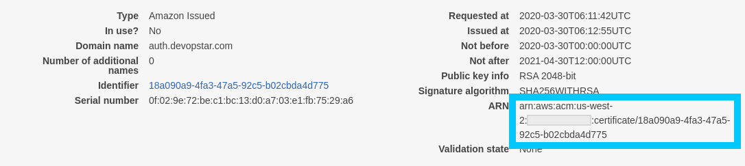 certArn: arn:aws:acm:us-west-2:xxxxxxxxxxxxx:certificate/5cde2e53-8f1b-44c1-920b-6556dc868239