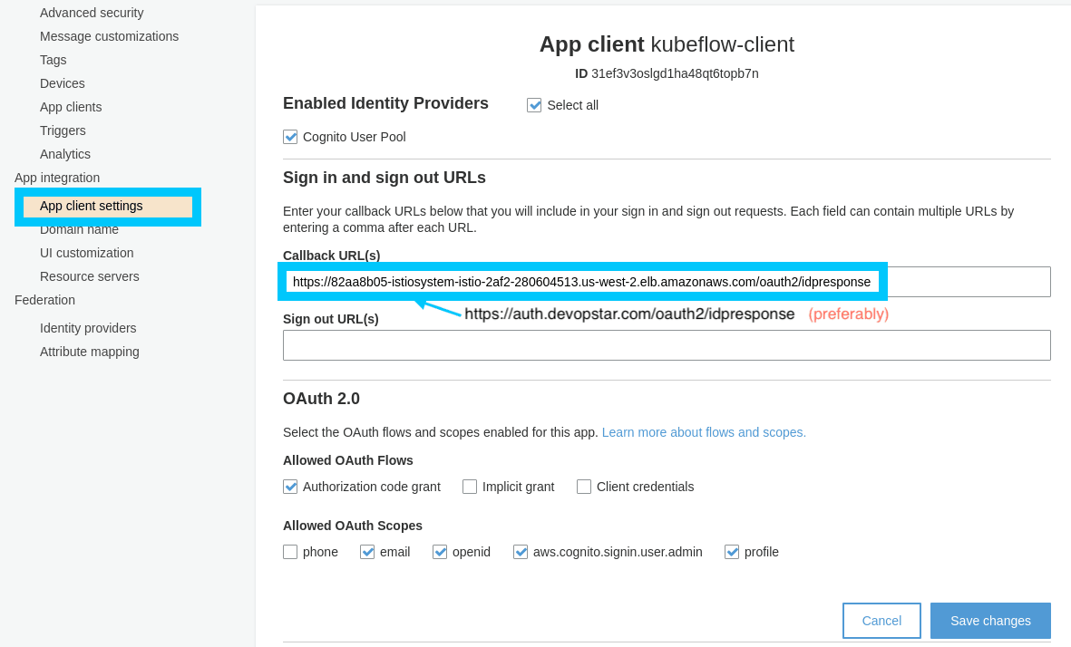 # https://auth.devopstar.com/oauth2/idpresponseBack in the Cognito console under our App client settings, insert the callback URL we just constructed.