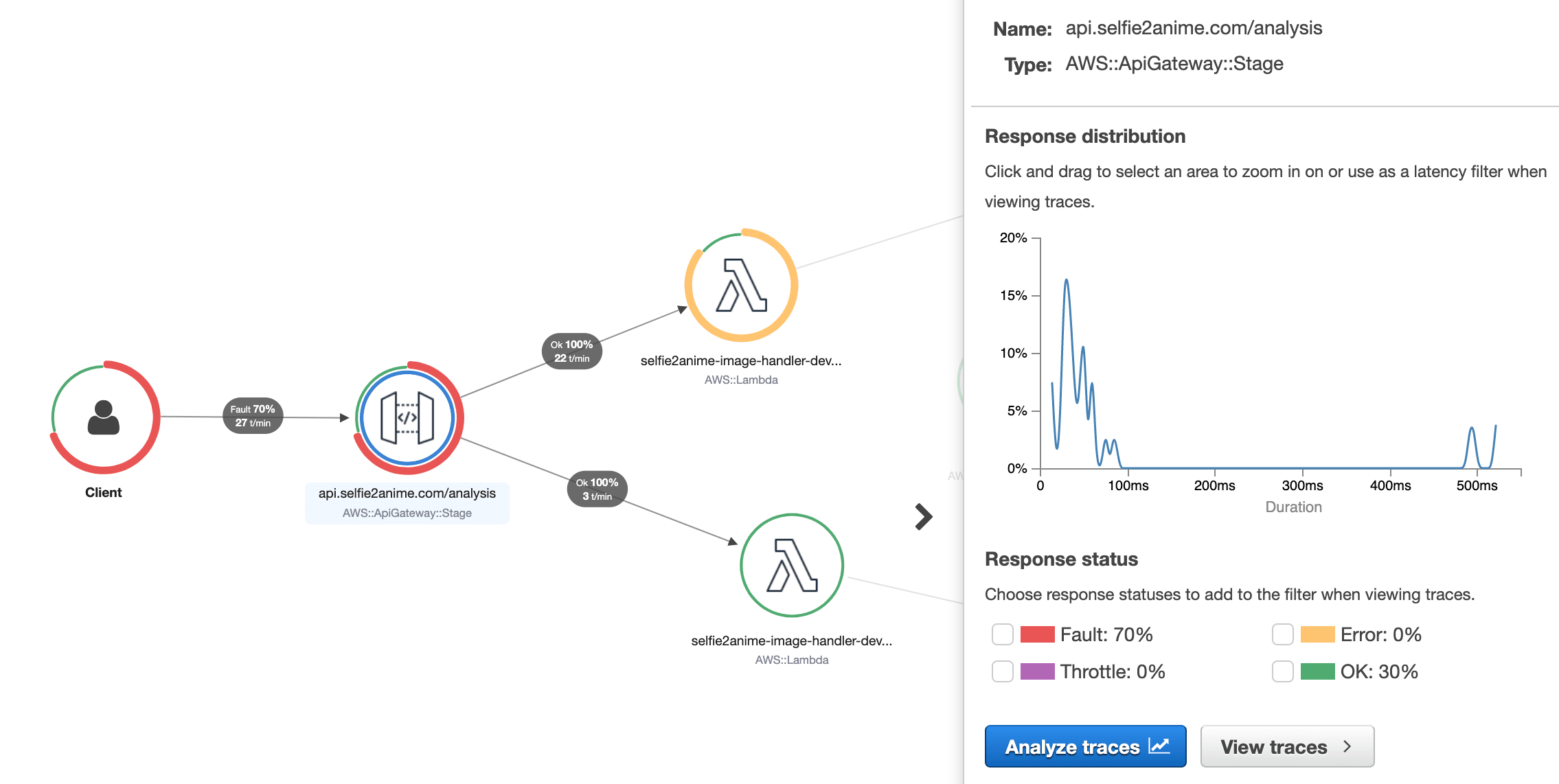 I had recently setup X-Ray tracing on the stack so the first place I went for guidance was the service graph. I could immediately see that not only was I receiving a lot more traffic, but a fair few requests were failing.