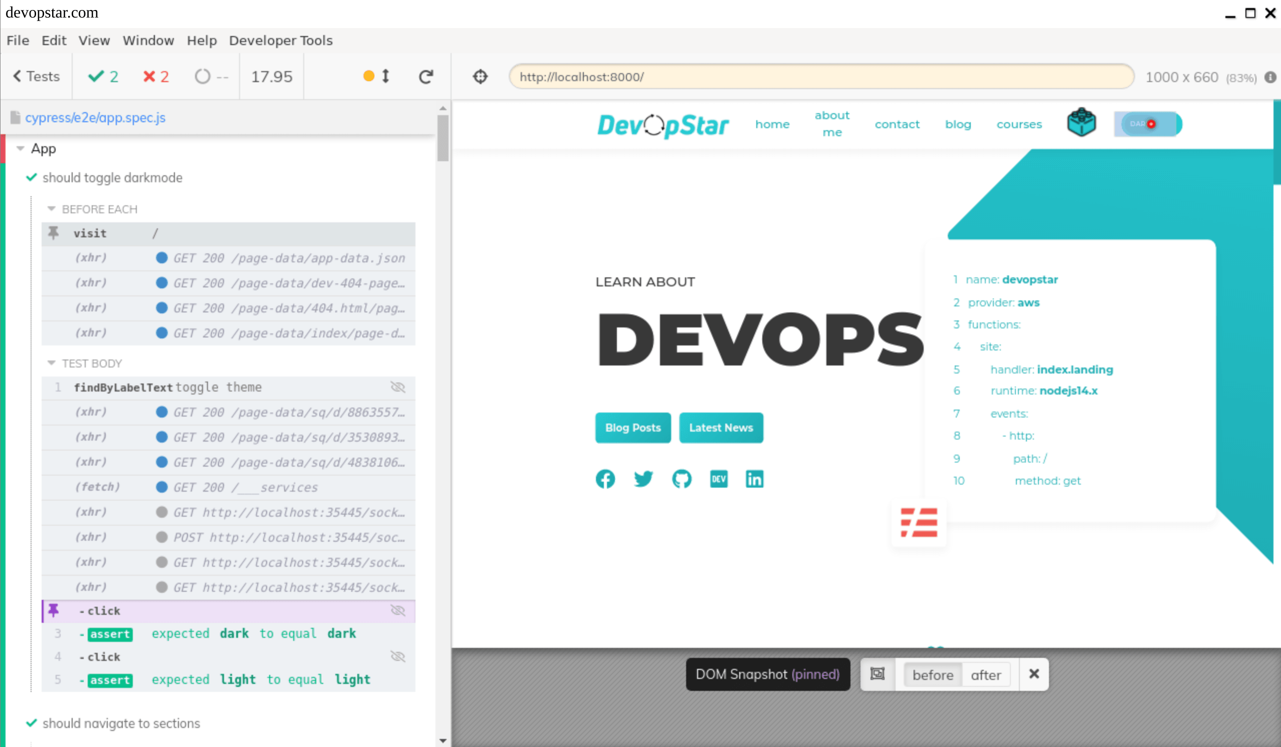 npm run test:e2eOnce Cypress has fired up, you should see it pop up in the browser at http://127.0.0.1:8080/index.html