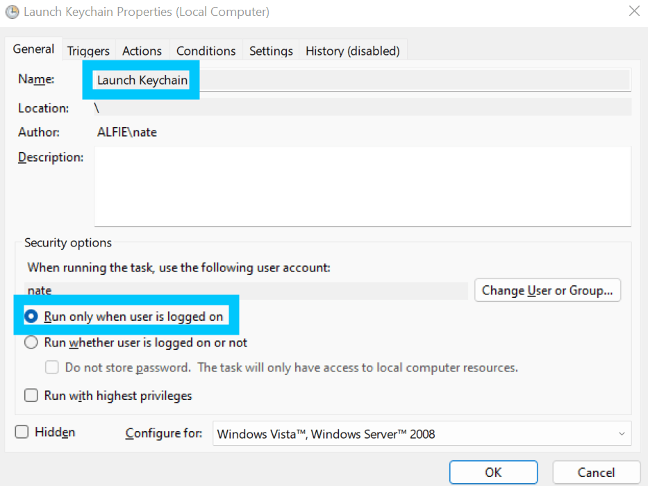 Finally, back in Windows open up Task Scheduler and Create a new task called Launch Keychain