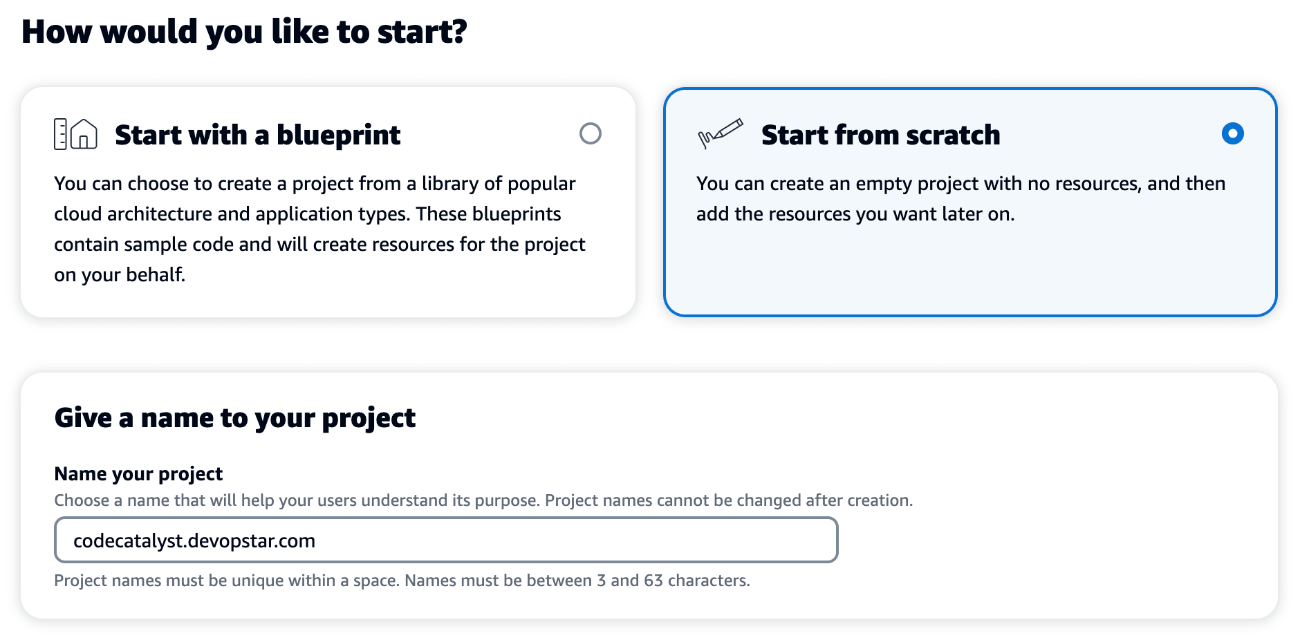 Give your project a name that makes sense to you, in my case I've gone with codecatalyst.devopstar.com implying that the project will deploy a website of that name.