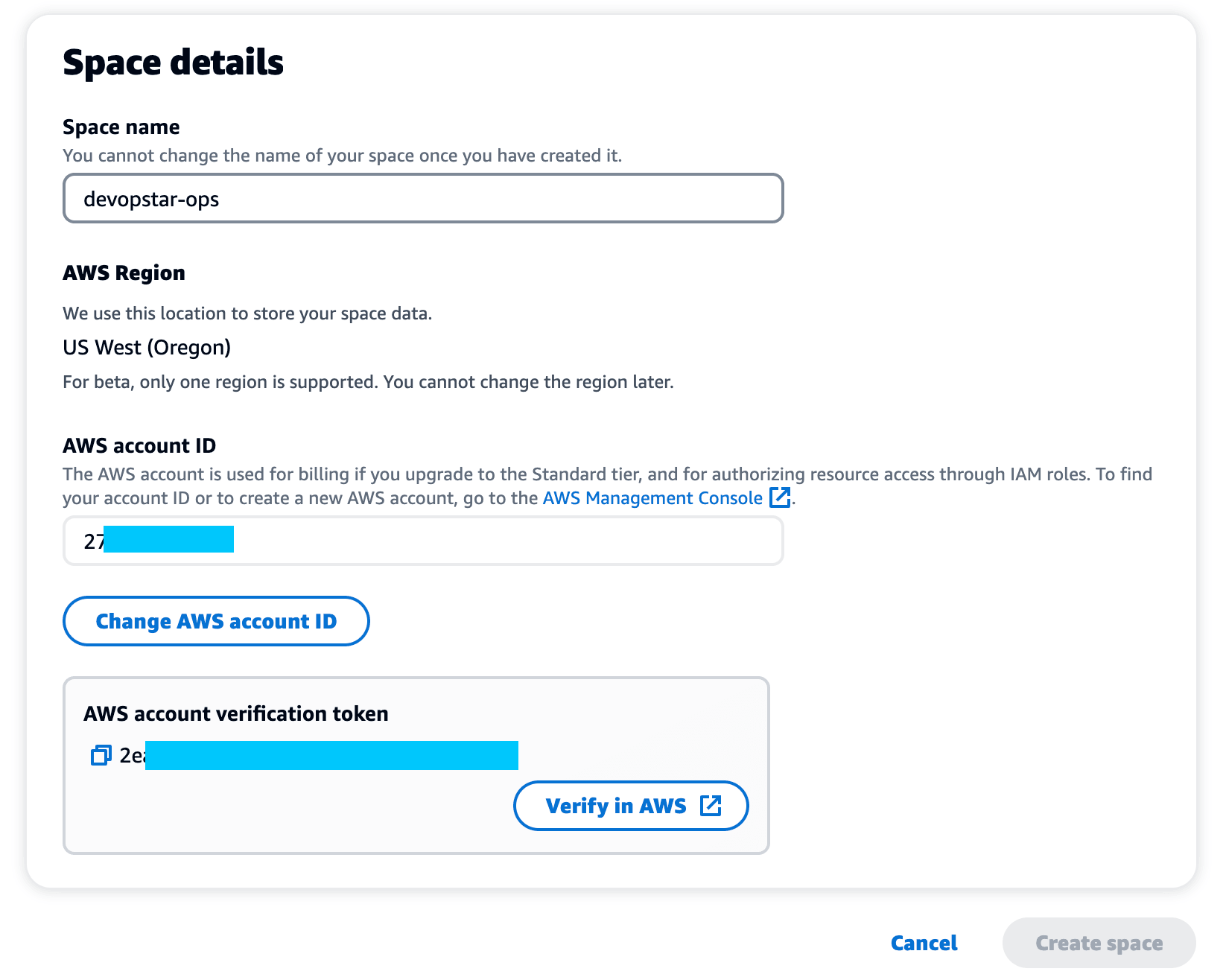 Paste the token from the CodeCatalyst page into the AWS console and click Verify Space.
