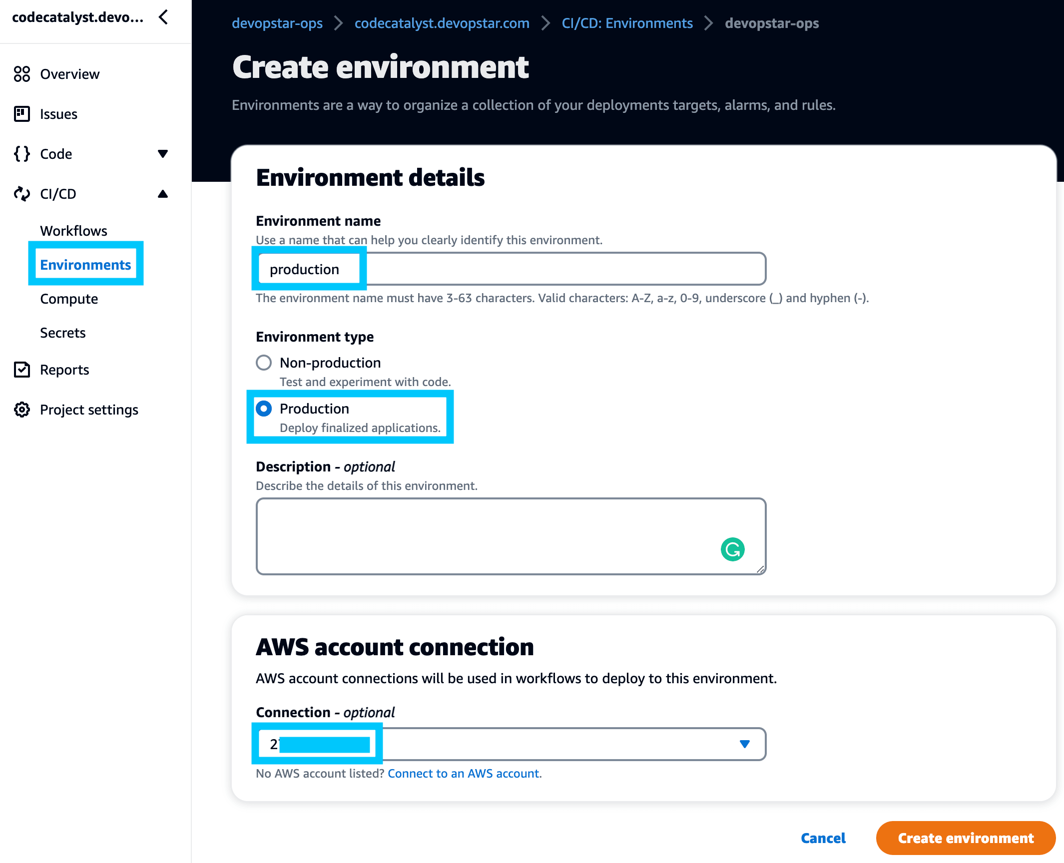 productionor whatever you called your environment in previous steps. - Account connection: set this to the AWS account connection you created at the start of this guide.