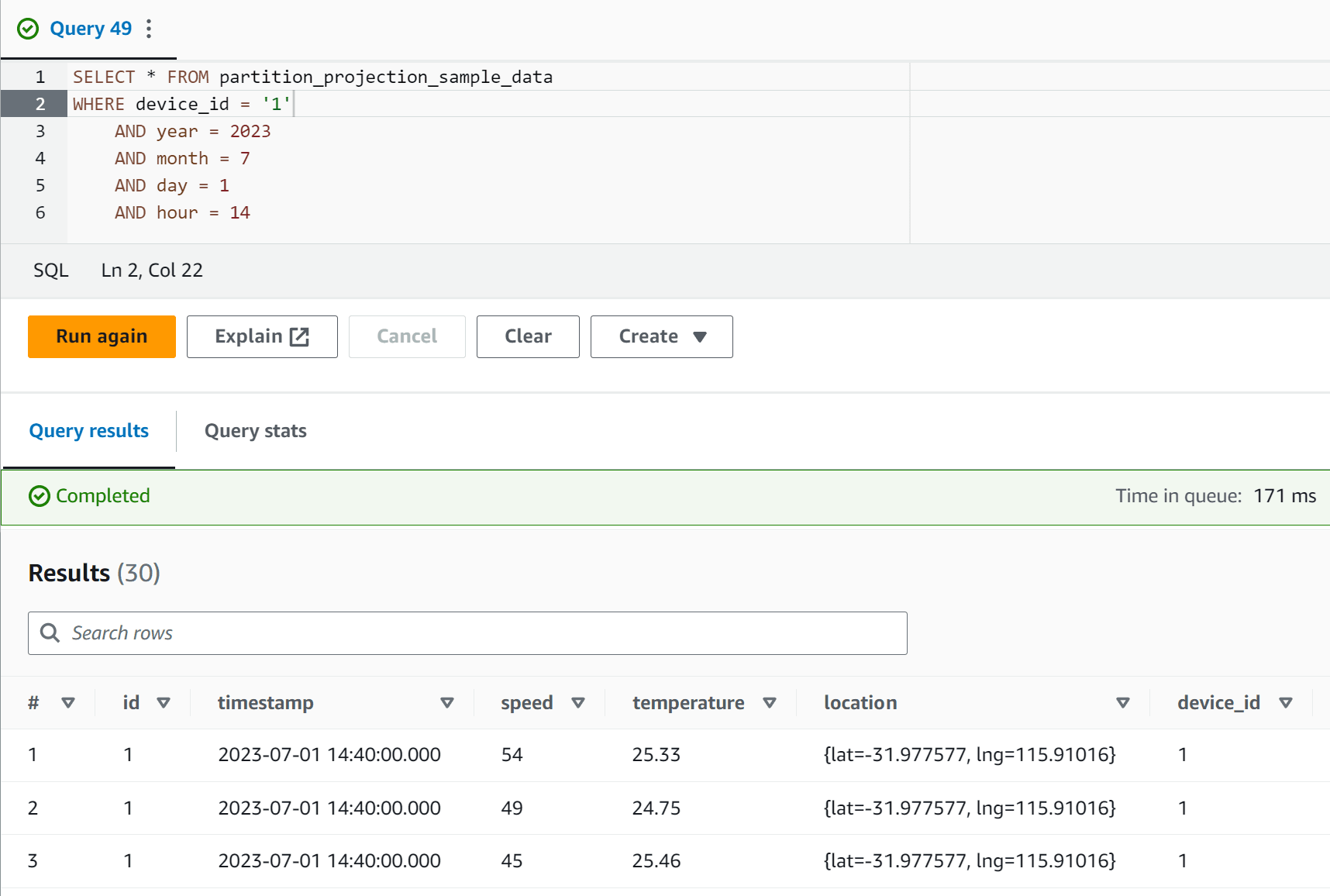 - WHERE device_id = '2': This part of the query demonstrates the power of partition projection. Instead of scanning all the data, Athena immediately knows to narrow the search to files inside the