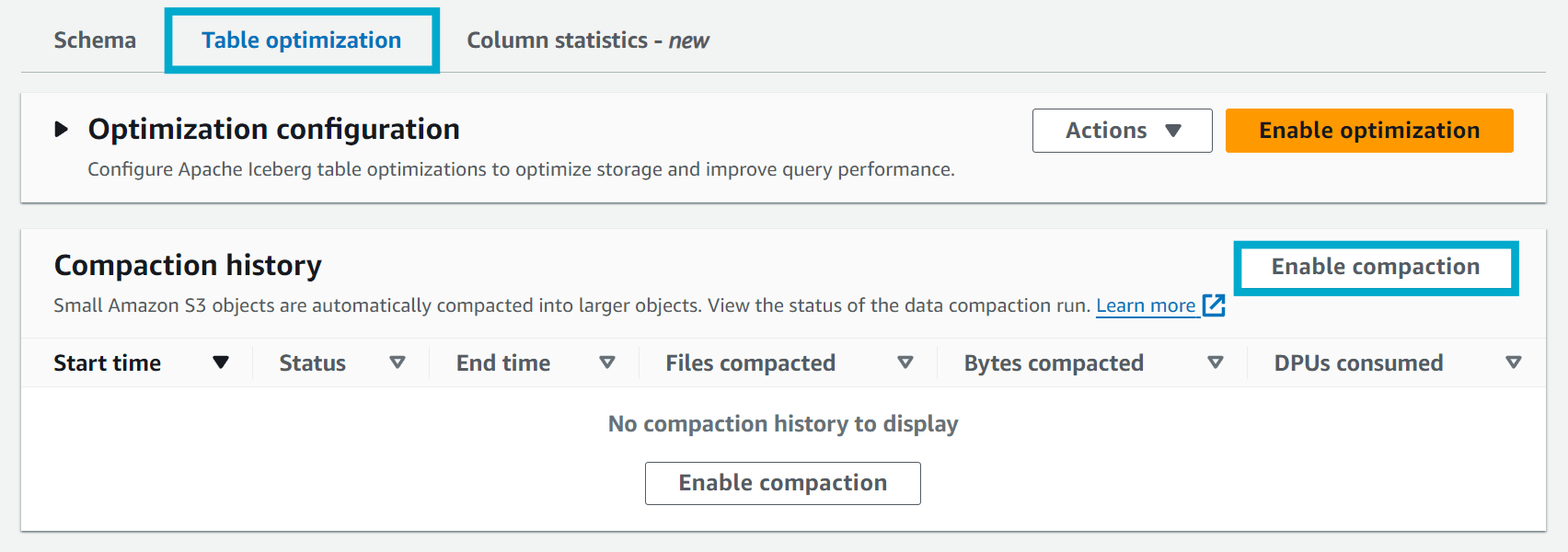 At the bottom of the table details, you should see a tab called Table optimization. Click it, then click Enable compaction.