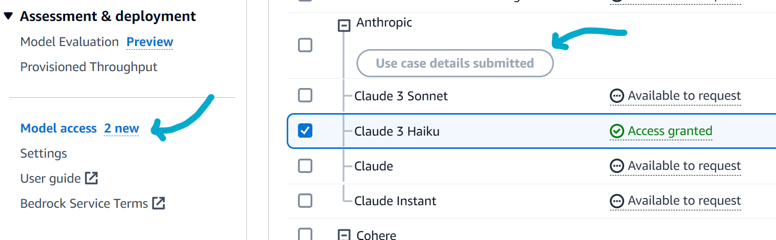 To use the new Claude 3 Haiku model, it must be enabled in the Amazon Bedrock console. Do this by navigating to the Model access console and clicking Manage model access. Then, select the Claude 3 Haiku model and click Save.
