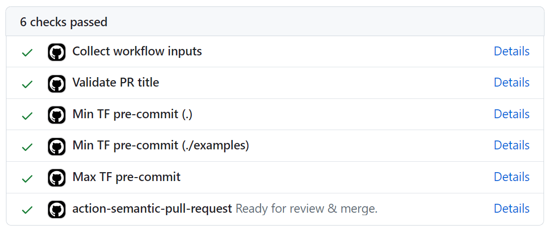 Terraform validate with tflint...........................................PassedIn the example above, the terraform-docs hook updated the README.md file with the latest variables, so you would need to commit the changes (run git add . and git commit -m "docs: Update README.md").